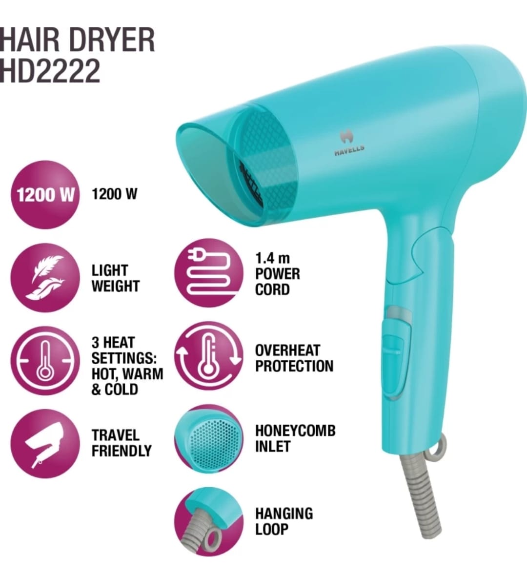 HAVELLS HD2222 Hair Dryer (1200 W, Blue)
